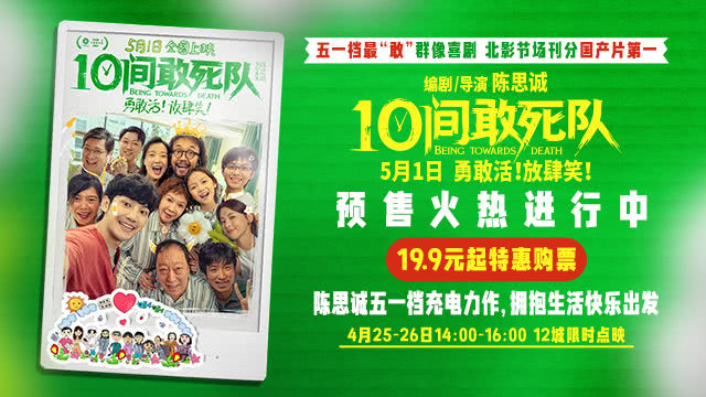 陈思诚编剧、执导的生命喜剧《10间敢死队》今日正式开启预售,同步曝光 “勇敢活!放肆笑!” 版终极预告,官宣4月25日-26日十二城限时点映,将于 5月1日登陆全国院线。影片由蒋龙、齐溪、杨超越、张弛等领衔主演,倪大红、蔡明等特别主演,入围北影节 “天坛奖” 主竞赛单元,更成为北影节史上首部加场放映的主竞赛影片,高···